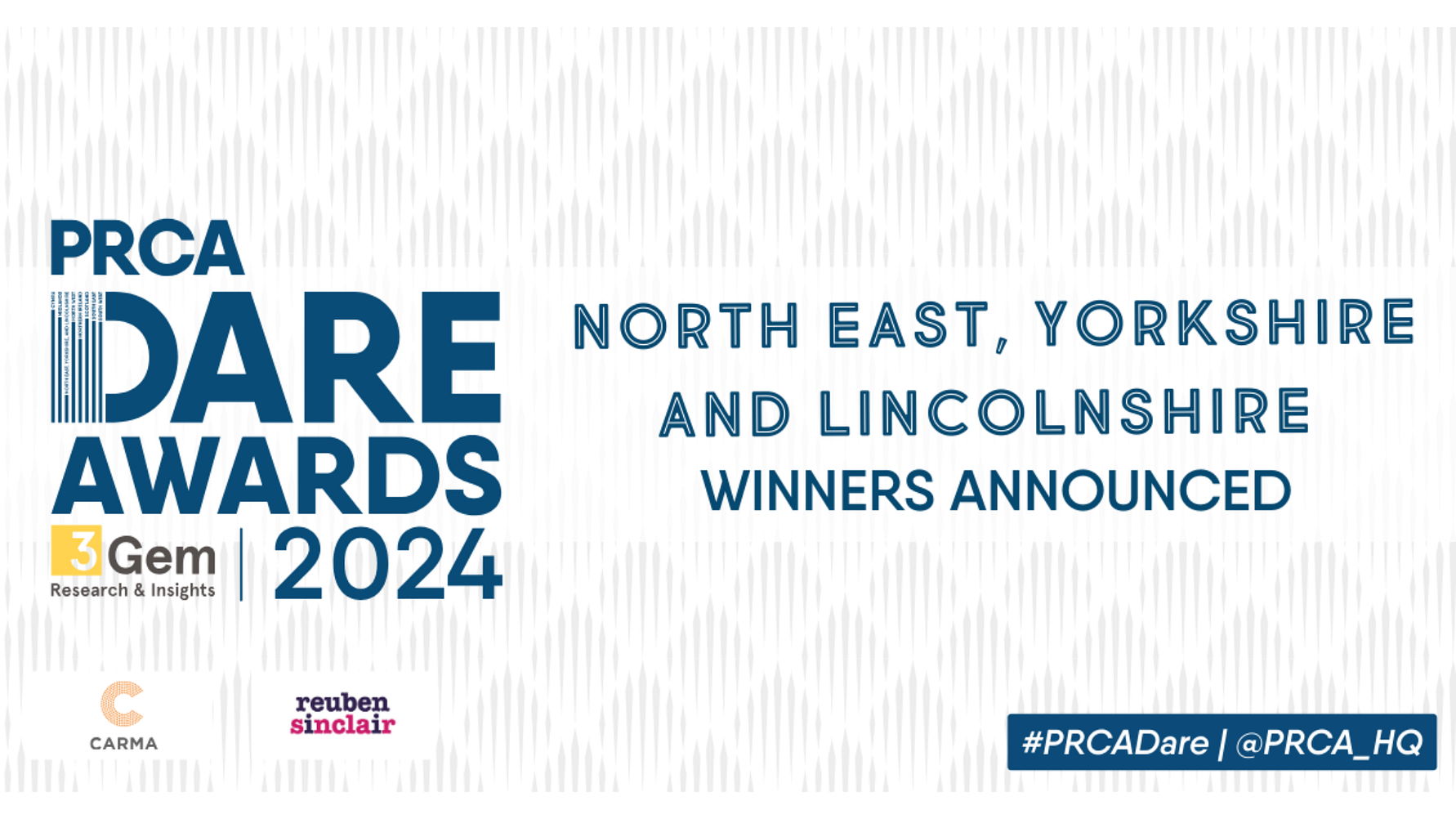 Last night, the PRCA DARE Awards North East, Yorkshire and Lincolnshire ceremony was held at DoubleTree by Hilton, Leeds City Centre honouring the outstanding PR and communications professionals. This year's edition of the awards is headline sponsored by 3Gem with additional sponsorship by CARMA and Reuben Sinclair.